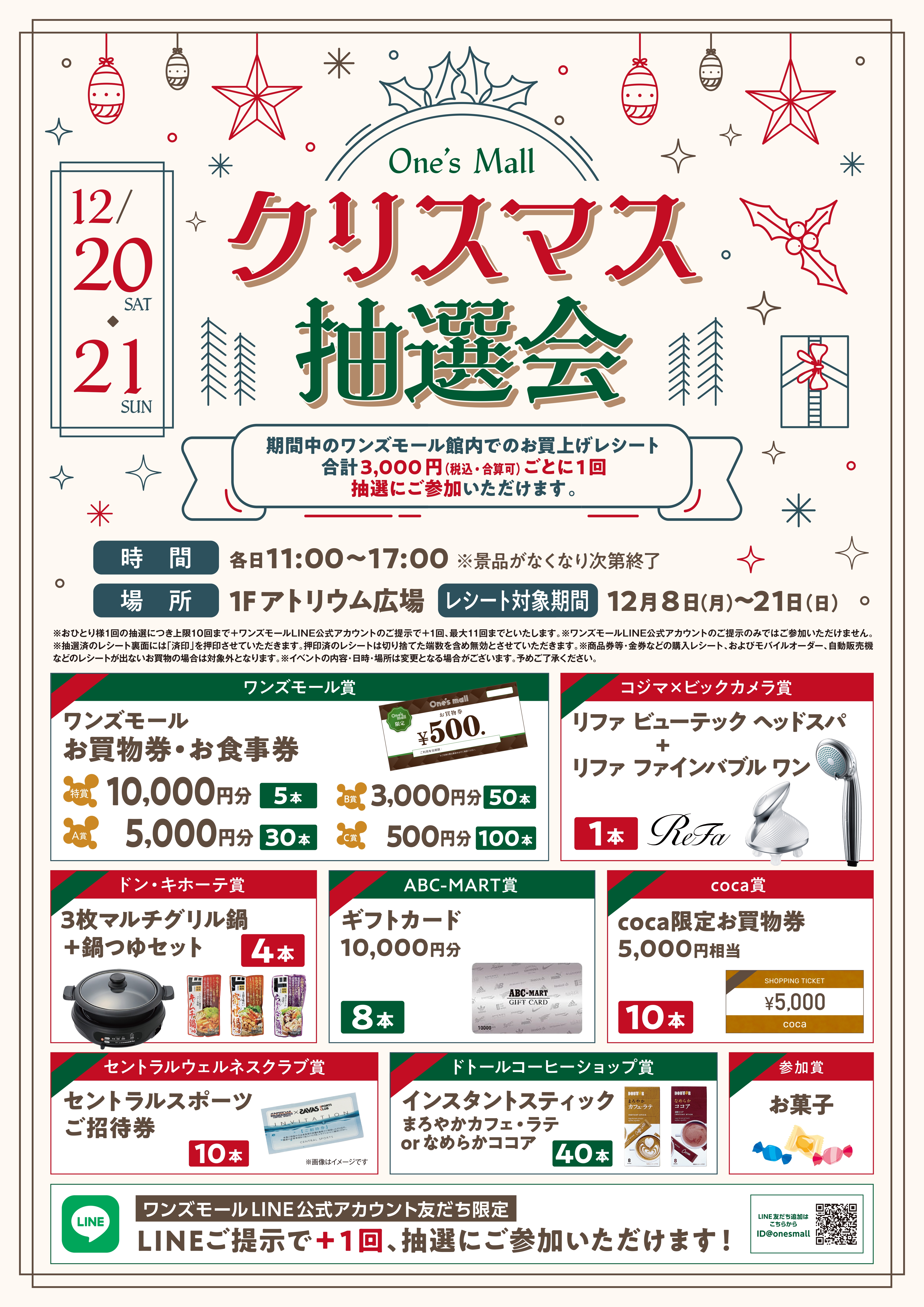 ワンズモールのお買物券や豪華景品が当たる、クリスマス抽選会を実施いたします♪