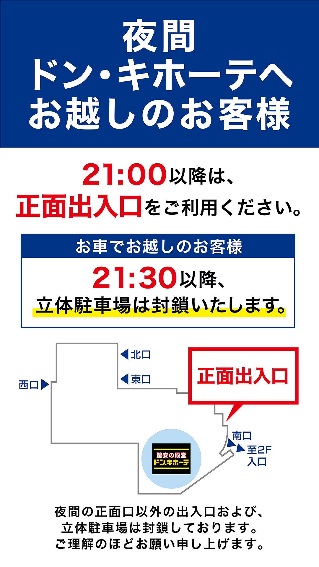 21:00以降にドン・キホーテへお越しの方は正面出入口をご利用ください。
